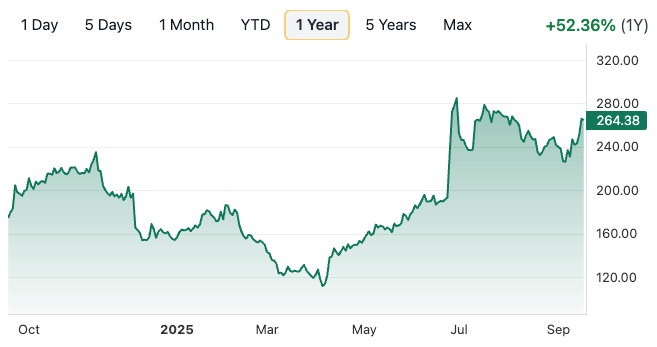 Looking to accumulate in the $260 range. This stock had a massive revenue spike last quarter and can continue to run, nearing it’s highs of $280 again.