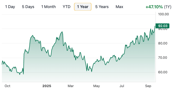 Looking to accumulate in the $90 range, which lines up with recent support levels in the $80 area. Steady moving stock with potential for a spike to $100.